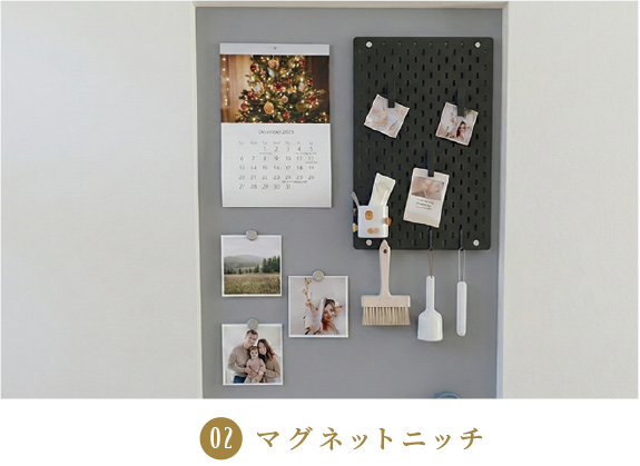 テーブル横などの壁面のくぼみを活用し、小物をスッキリ収めます。