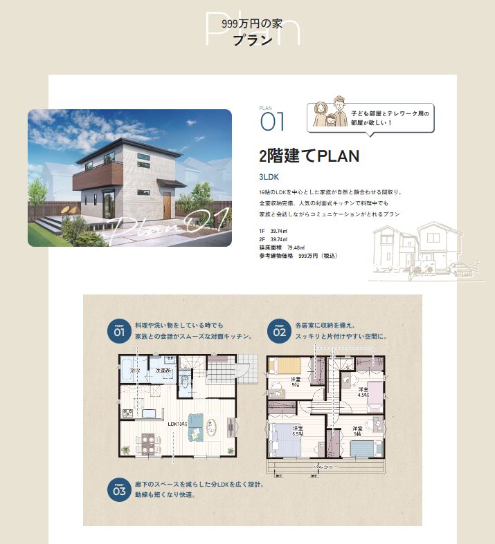 建物本体価格が税込999万円という圧倒的なコストパフォーマンスで注目を集める規格住宅プランです。