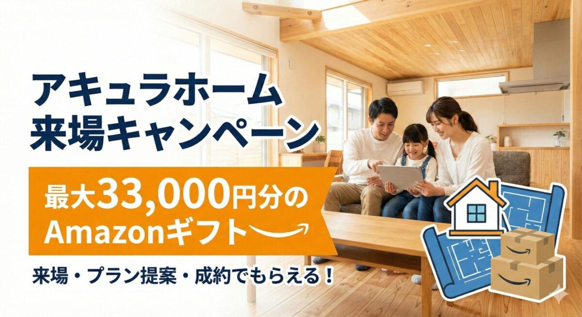 2026年2月現在、アキュラホームで開催中のキャンペーンは以下の通り。 \ ステップアップで最大総額 33,000円分 / 豪華プレゼントキャンペーン 特典 1 来場予約 3,000円分 Amazon ...