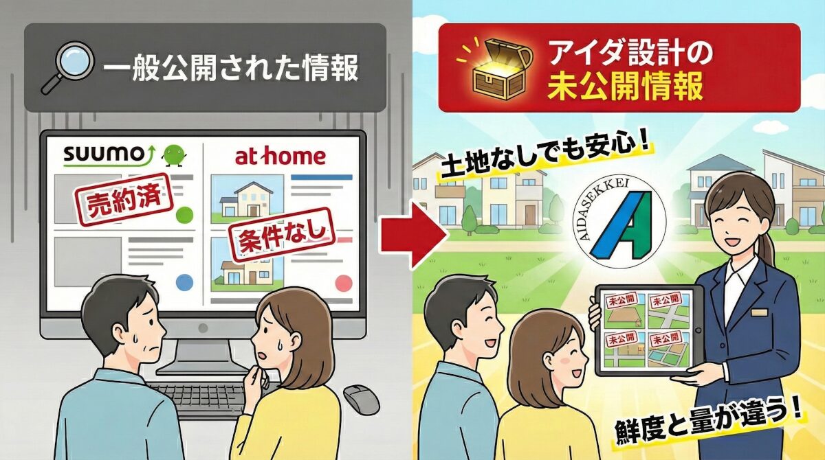 アイダ設計の「土地+注文住宅」サービスの最大の強みは、情報の鮮度と量です。