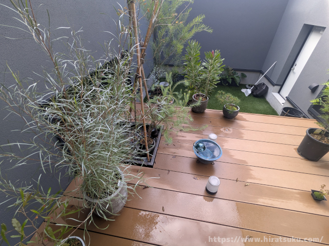 また、雨上がりのウッドデッキは乾きにくく、乾いた後も雨染み?みたいのが残るのもデメリット。