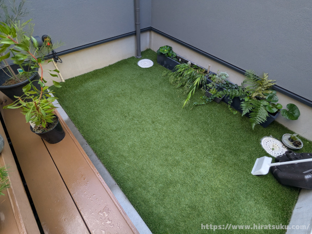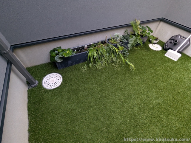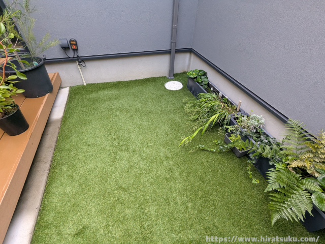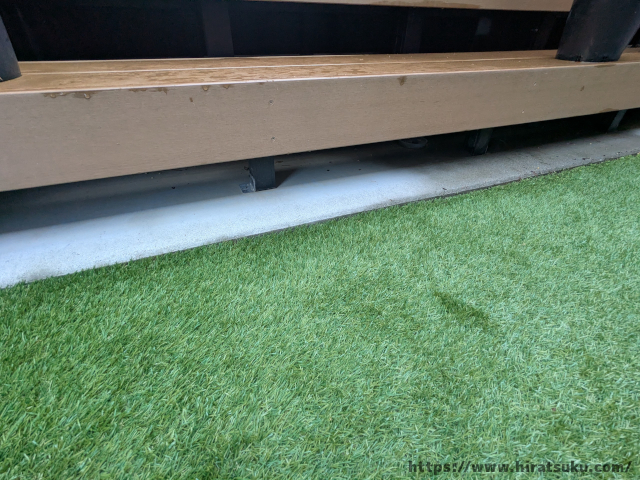 ウッドデッキ下はコンクリート施工、人工芝は水はけが良く、
